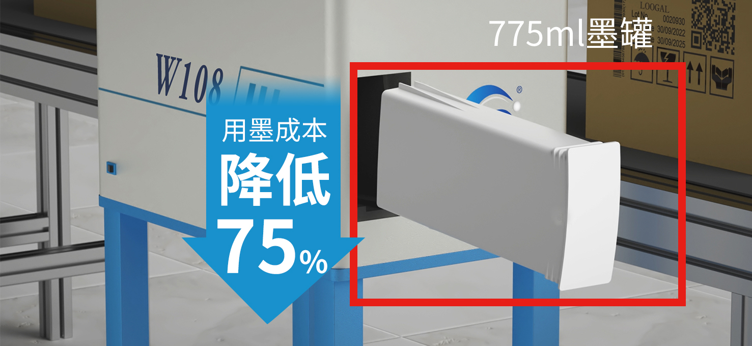 W108喷码机配备775ml大墨盒,可以有效降低了用墨成本,帮助用户实现成本控制。