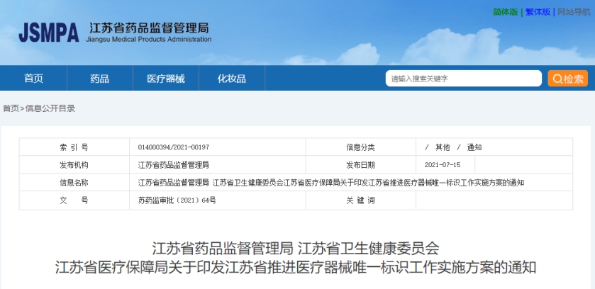 7月26日消息,江苏省药监局联合省卫健委、省医保局印发《江苏省推进医疗器械唯一标识工作实施方案》。