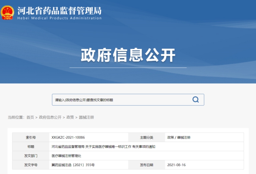 8月16日,河北省药监局印发《关于实施医疗器械唯一标识工作有关事项的通知》(以下简称“《通知》”),规定2021年11月1日起生产的医疗器械应当具有医疗器械唯一标识,以及申请首次注册、延续注册或者注册变更时,注册申请人/注册人应当提交产品标识。